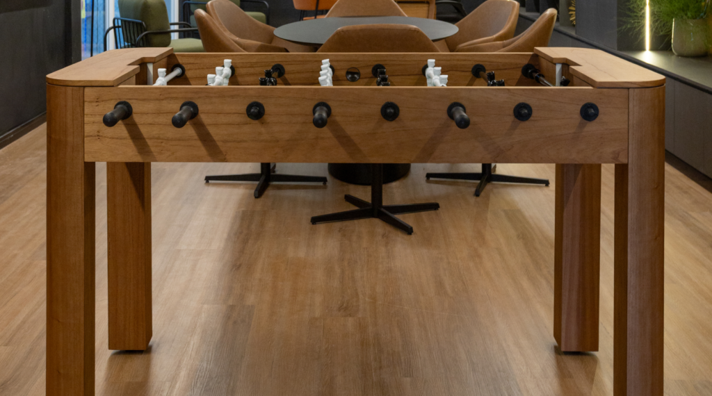 Complementando a linha, a mesa de pebolim Maro apresenta o jogo de uma forma inusitada que transita entre jogos de futebol e espaços mais sofisticados.